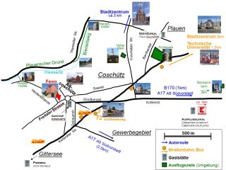 Anfahrt Auto Sie kommen auf der A4 von Berlin oder Chemnitz und biegen am Autobahndreieck Dresden West auf die A17 in Richtung Prag ab bis zur Anschlussstelle Dresden-Südvorstadt und fahren auf die B170 in Richtung Dresden Zentrum; dann biegen sie an der nächsten Ampelkreuzung links in die Stuttgarter Strasse nach Coschütz/Gittersee ab (sie fahren dann durch ein Gewerbegebiet) bis zur Gebauer Straße in Richtung Altcoschütz (ab Autobahnanschlußstelle Dresden Südvorstadt ca. 2km). Bahn Sie kommen vom Hauptbahnhof Dresden und fahren mit der Strassenbahn Nr. 3 stadtauswärts bis Achtbeeteweg (11 min - 8 Haltestellen) und laufen dann in Richtung Altcoschütz ca. 5 min. |